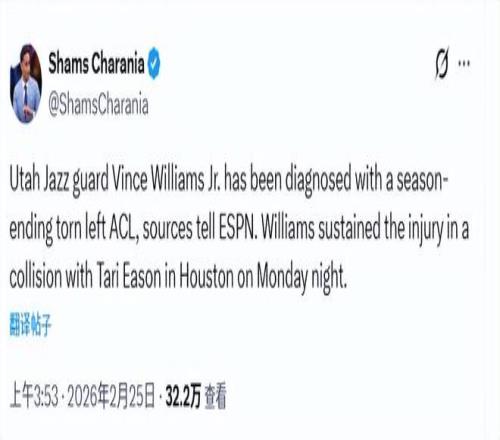 北京時間2月25日,據名記Shams報道,在接受進一步檢查后,爵士球員小文斯-威廉姆斯確診為左膝前交叉韌帶(ACL)撕裂。...