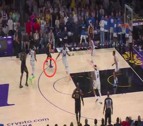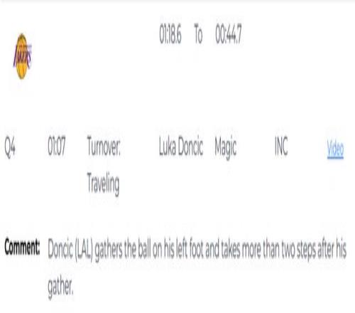 第一次漏判發(fā)生在距離比賽結束還有1分7秒,東契奇在左腳觸地時完成合球,合球后多走了兩步以上,構成走步違例。裁判沒有響哨,這是一次漏吹的走步違例,湖人獲利,魔術吃虧。