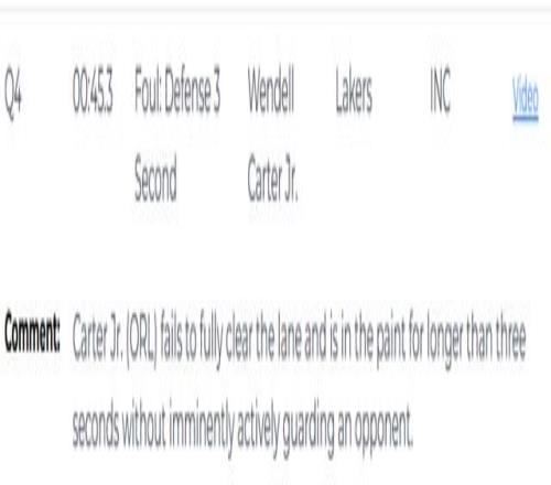 第二次漏判發(fā)生在距離比賽結束還有45.3秒,魔術的小卡特在沒有積極防守對位球員的情況下,在己方禁區(qū)停留時間超過3秒,這是一次漏吹的防守三秒違例,湖人吃虧,魔術獲利。