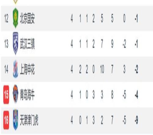 如今仍然積分為負分的球隊還有5支,除了上面所提到北京國安和上海申花之外,還有武漢三鎮、青島海牛和天津津門虎。如今聯賽唯一一支沒有拿到過勝利的球隊就是天津,賽季開始后他們4輪比賽成績是1平3負,不管是面對老牌豪門還是升班馬,不管是主場還是客場,天津都沒有拿到比賽的勝利,他們也被認為是降級的最熱門球隊。